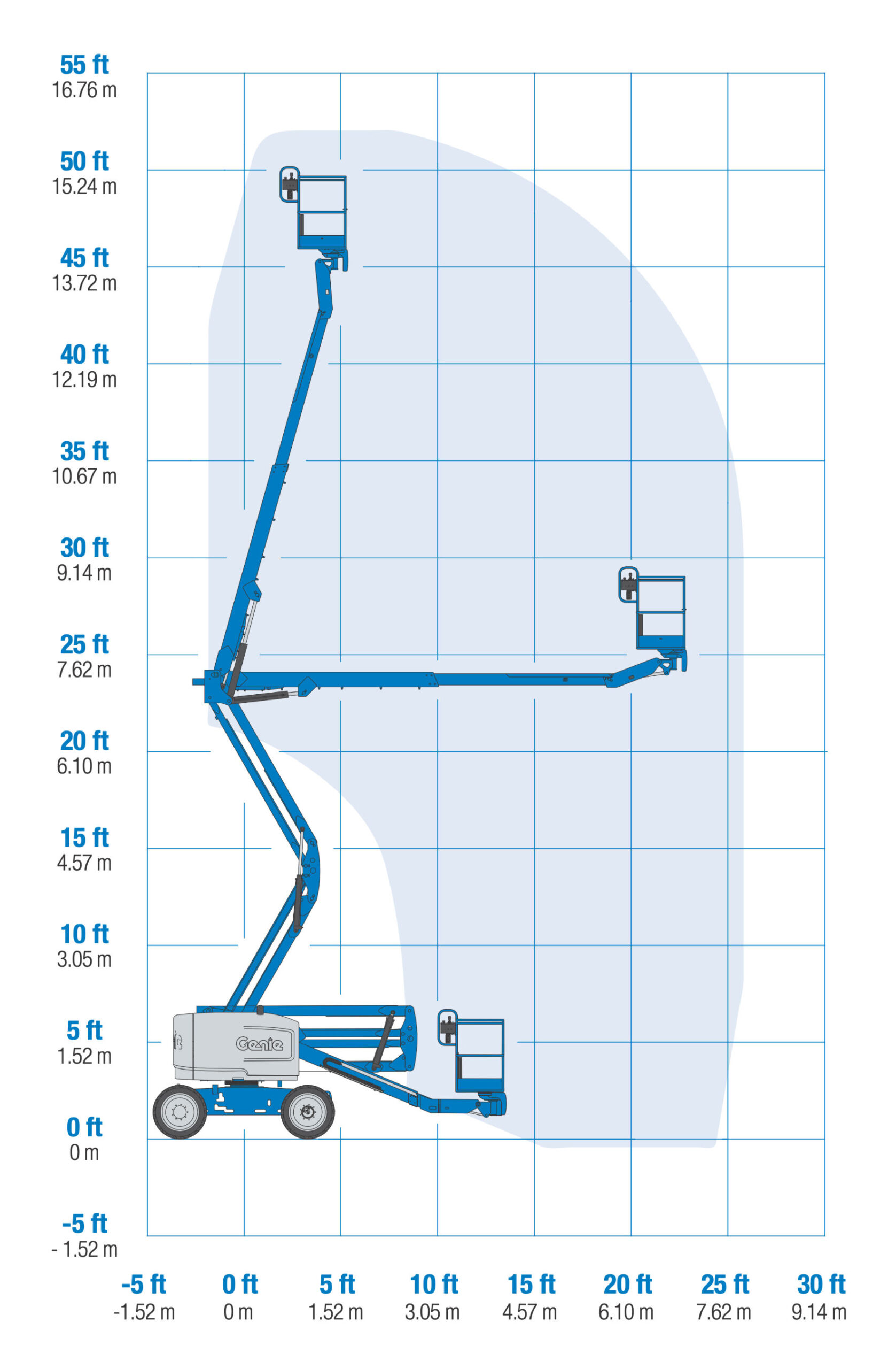 Mit einer Korblast von 227 kg ermöglicht sie das sichere Heben von Personen sowie Werkzeugen, was sie zu einer zuverlässigen Lösung für verschiedenste Höhenarbeiten macht.
