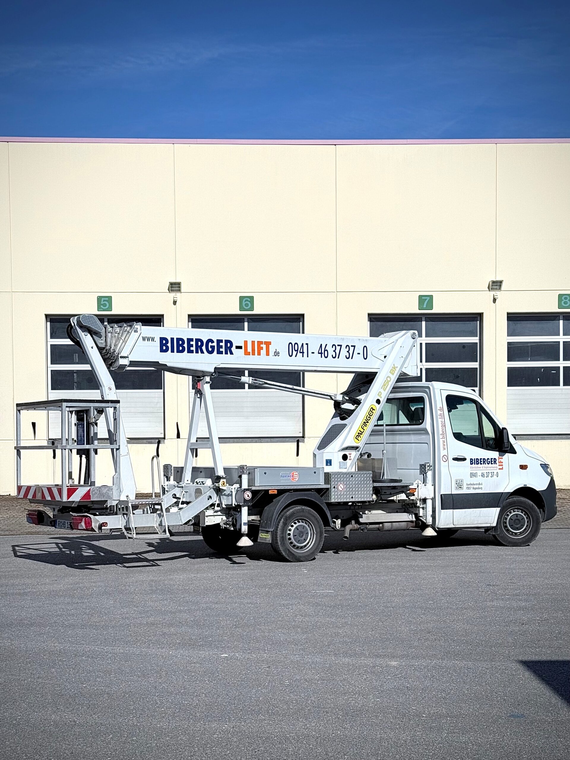 Unsere LKW-Arbeitsbühne LK-250-TK auf einem 3,5-Tonnen Mercedes-Benz-Fahrgestell bietet eine beeindruckende Arbeitshöhe von 25 Metern und eine seitliche Reichweite von 14,2 Metern. Mit dieser Bühne können Sie sicher und effizient in großen Höhen arbeiten.