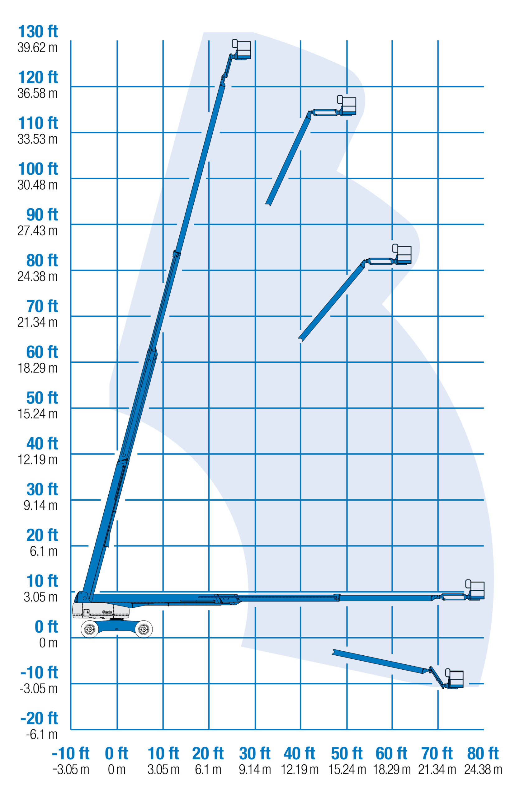 Mit der TB-400-D können Sie Arbeiten in bis zu 40,15 Metern ausführen. Ein Projekt auf einer Werft oder in einem Stadion lässt sich somit einfach realisieren. Mit dieser Arbeitsbühne kann eine horizontale Reichweite von mehr als 24 Metern überbrückt werden. Die Plattformkapazität beträgt 227 kg. Die Teleskopbühne Genie S-125 hat eine 360°-Endlosdrehung und die Plattform selbst kann um 160° drehen.